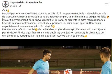 Acest gest l-a deranjat pe selecționerul Mirel Rădoi care i-a transmis fotbalistului că nu va mai fi convocat la echipa națională. Suporterii lui Gaz Metan Mediaș s-au arătat nemulțumiți de faptul că Ronaldo Deaconu nu joacă la naționala U23 prezentă la Jocurile Olimpice de la Tokyo și au publicat un mesaj pe Facebook care l-a deranjat pe selecționer.