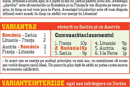 Interesant este că toate calculele oficialilor se bazează și pe faptul că Franța va opri marșul surprizei Lituania, cu care se va întâlni de două ori în patru zile, în sensul că elevii lui Domenech vor învinge în ambele meciuri. Dacă se vor întâmpla lucrurile spuse mai sus, naționala lui Piți va rămâne doar cu Serbia adversar pentru locul doi, cel care ne asigură locul la baraj.