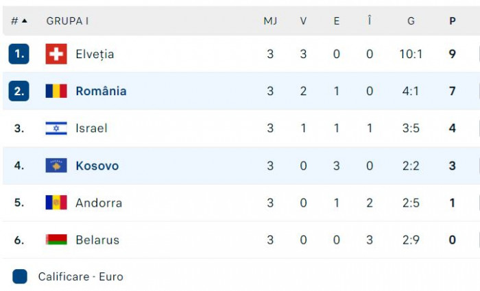 Israel ar putea să egaleze România în clasament săptămâna viitoare, în cazul în care tricolorii pierd cu Elveția, iar Andorra va pierde în următoarea etapă.