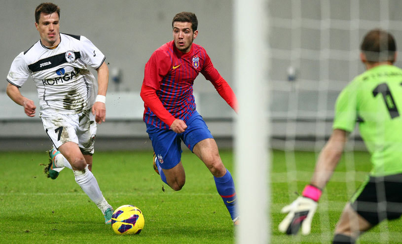 Azdren Llullaku, în duel cu Alex Chipciu într-un meci jucat de Gaz Metan cu Steaua, în 2013