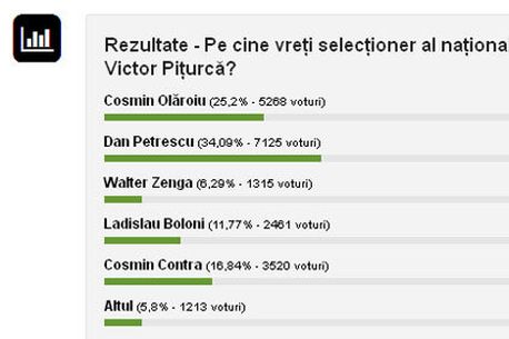 Din momentul în care a fost creat, adică imediat după ce Pițurcă a pus pixul pe contractul saudiților, și până acum, sondajul indică faptul că Dan Petrescu a strâns peste 34% dintre preferințele microbiștilor și ar fi favoritul fanilor. La mai bine de 9 procente distanță se află Cosmin Olăroiu, iar al treilea în topul tehnicienilor doriți să ne conducă spre EURO este Cosmin Contra.