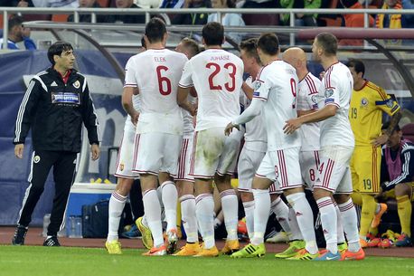Victor Pițurcă se pregătește să-l bage în teren pe Bogdan Stancu, în timp ce maghiarii celebrează golul egalizator