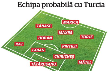 Selecționerul are de rezolvat câteva probleme în puținele ore rămase până la disputarea meciului cu turcii, iar cea mai arzătoare dintre ele este legată de absența lui Bourceanu. Cel mai probabil, Pițurcă va merge pe varianta titularizării lui Hoban, cel care ar urma să facă pereche cu Pintilii la mijlocul terenului: „Nu îl văd pe Chiricheș o variantă pentru postul de închizător. Folosirea lui Hoban mi se pare o idee mai bună și faptul că l-a introdus în teren contra Ungariei arată că va fi folosit marți”, a comentat și Dorinel Munteanu, cel mai selecționat tricolor din toate timpurile.