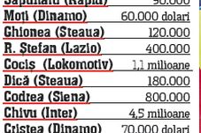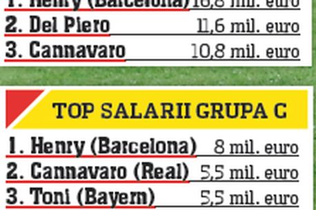 Adunând sumele pe care internaționalii noștri le câștigă într-un an, se ajunge la 16,1 milioane de euro. Ceva mai mult de atât ia francezul Thierry Henry în aceeași perioadă, ce-i drept nu doar din salariu, ci și din prime și publicitate. Vârful Barcelonei câștigă pe sezon 16,8 milioane de euro, fiind al cincilea fotbalist de pe planetă la capitolul venituri anuale, lider autoritar fiind David Beckham, cu câștiguri de peste 31 de milioane.