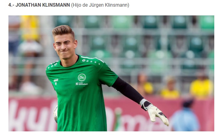 Locul următor este ocupat de un alt german: Jonathan Klinsmann, băiatul fostului internațional Jurgen Klinsmann. El nu a ajuns atacant ca părintele său și a preferat să fie portar. A debutat în Bundesliga la Hertha Berlin, iar acum joacă în Elveția la St Gallen.