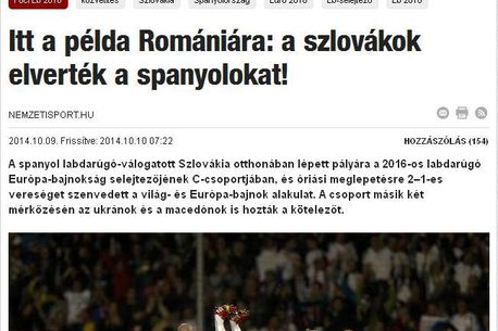 Jurnaliștii de la Nemzeti au găsit o metodă inedită de a-i motiva pe jucătorii lui Pal Dardai. După ce Spania a pierdut surprinzător meciul contra celor din Slovacia, scor 1-2, aceștia au titrat pe prima pagină următorul mesaj: „Luați exemplu pentru partida cu România: slovacii i-au învins în mod surprinzător pe spanioli. Faceți și voi așa!”. România e văzută favorită chiar și de către oamenii de sport din Ungaria. Maghiarii au fost cinematograf înainte de sosirea programată vineri la București, iar în ultima zi de cantonament au primit învoire de la selecționer pentru a sta cu familiile.