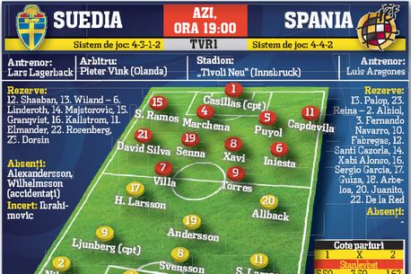 Favoritele din Grupa D, Spania și Suedia, se vor întâlni astăzi într-o partidă pe care nici unii și nici ceilalți nu au dat semne că ar fi deranjați să o termine la egalitate, mai ales că ambele echipe vin după două victorii concludente în prima rundă.