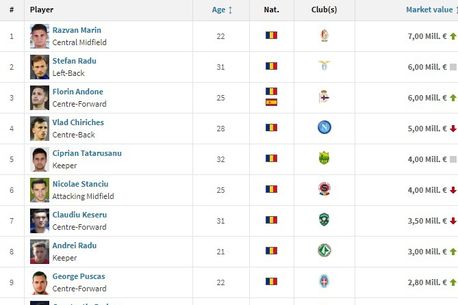 În traducere liberă, Radu tocmai a devenit al optulea cel mai bine cotat fotbalist român și, dintre portari, e întrecut doar de Ciprian Tătărușanu, cotat la patru milioane de euro. Topul e condus de Răzvan Marin, a cărui cotă a ajuns la șapte milioane de euro, Ștefan Radu și Florin Andone, ultimii doi cotați la șase milioane de euro.