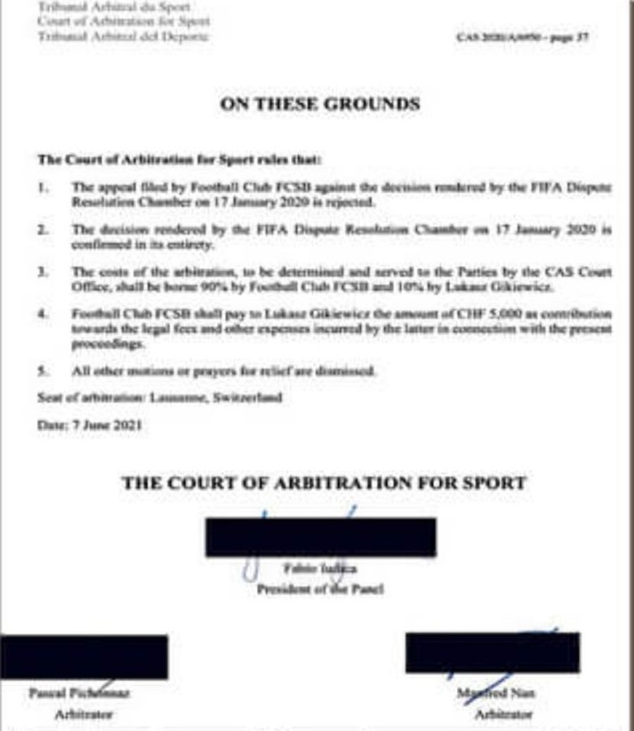 Gigi Becali este contrazis de documentul care certifică hotărârea TAS din cazul procesului FCSB – Lukasz Gikiewicz. Astfel, Tribunalul de Arbitraj Sportiv din Lausanne confirmă verdictul stabilit de FIFA și respinge apelul înaintat de FCSB. Mai mult, clubul deținut de Gigi Becali va trebui să suporte și 90% dintre costurile pe care le implică un proces la TAS.