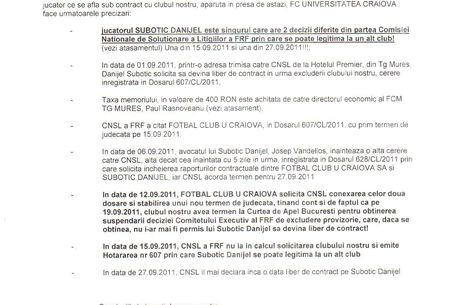 – In data de 12.09.2011, FOTBAL CLUB U CRAIOVA solicita CNSL conexarea celor doua dosare si stabilirea unui nou termen de judecata, tinand cont si de faptul ca pe 19.09.2011, clubul nostru avea termen la Curtea de Apel Bucuresti pentru obtinerea suspendarii deciziei Comitetului Executiv al FRF de excludere provizorie, care, daca se obtinea, nu i-ar mai fi permis lui Subotic Danijel sa devina liber de contract!