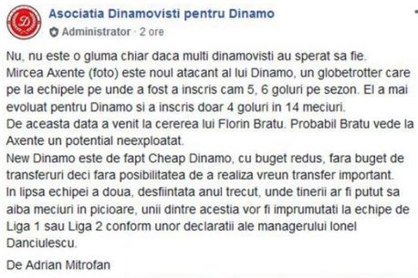 „Nu, nu este o glumă, chiar dacă mulți dinamoviști au sperat să fie. Mircea Axente este noul atacant al lui Dinamo, un globetrotter care pe la echipele pe unde a fost a înscris cam 5, 6 goluri pe sezon. El a mai evoluat pentru Dinamo și a înscris doar 4 goluri în 14 meciuri. De această dată a venit la cererea lui Florin Bratu. Probabil Bratu vede la Axente un potențial neexploatat. New Dinamo este de fapt Cheap Dinamo, cu buget redus, fără buget de transferuri deci fără posibilitatea de a realiza vreun transfer important. În lipsa echipei a doua, desființată anul trecut, unde tinerii ar fi putut să aibă meciuri în picioare, unii dintre aceștia vor fi împrumutați la echipe de Liga 1 sau Liga 2 conform unor declarații ale managerului Ionel Dănciulescu”, scrie Asociația Dinamoviști pentru Dinamo prin intermediul unui comunicat.