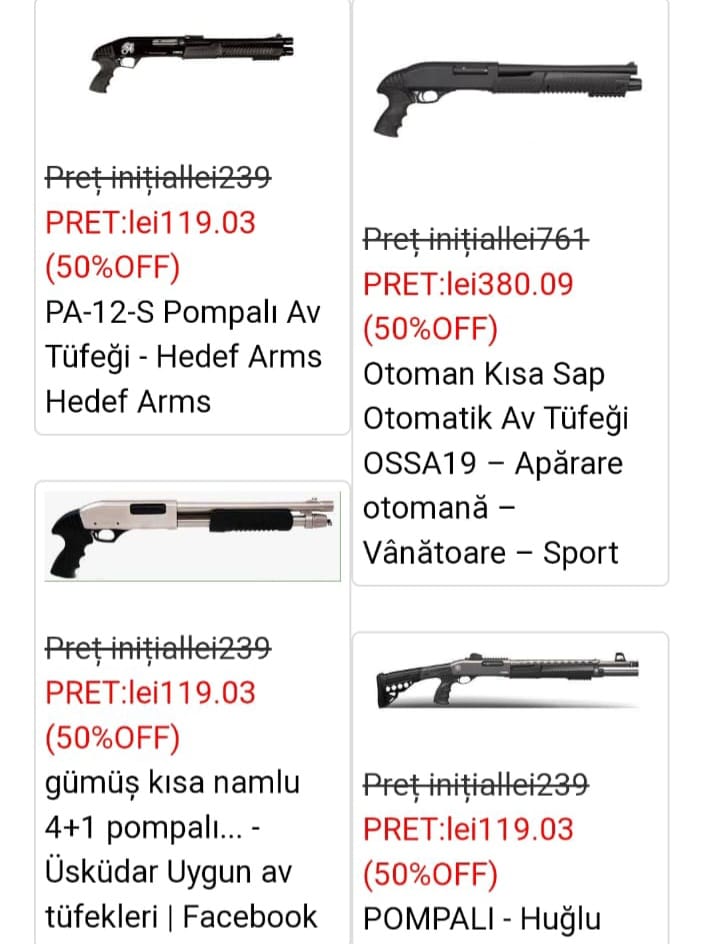 Pe baza fotografiilor am căutat genul acesta de armament pe internet și am găsit aceleași obiecte la vânzare, pe site-uri din Turcia – acolo de unde provine și mare parte din materia primă pirotehnică-, la prețuri cuprinse între 100 și 400 de lei. Este vorba de arme neletale, cu aer comprimat, care pot fi folosite, în baza unui permis, de firmele de pază, în poligonul de tir sau la vânătoare.