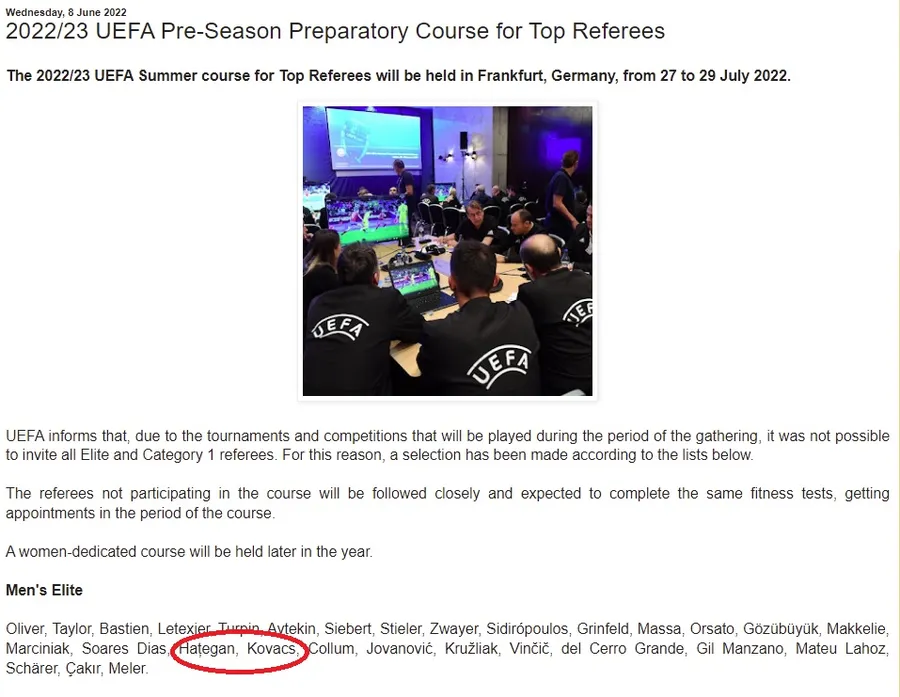 De altfel, UEFA l-a și convocat la 27 iulie 2022 la o consfătuire a arbitrilor First Class și Elite, la care participă și Istvan Kovacs, plus Radu Petrescu și Horațiu Feșnic (ambii din a doua categorie).