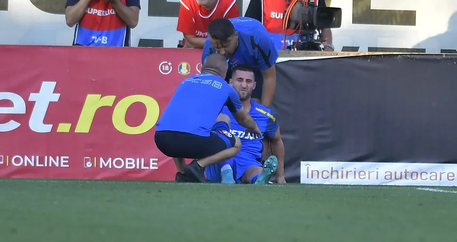 Ovidiu Marian Popescu accidentat in meciul de fotbal dintre CS Mioveni si FCSB, contand pentru Superliga Superbet, desfasurat pe Stadionul Orasenesc din Mioveni, sambata 6 august 2022. © FOTO:Razvan Pasarica/SPORT PICTURES