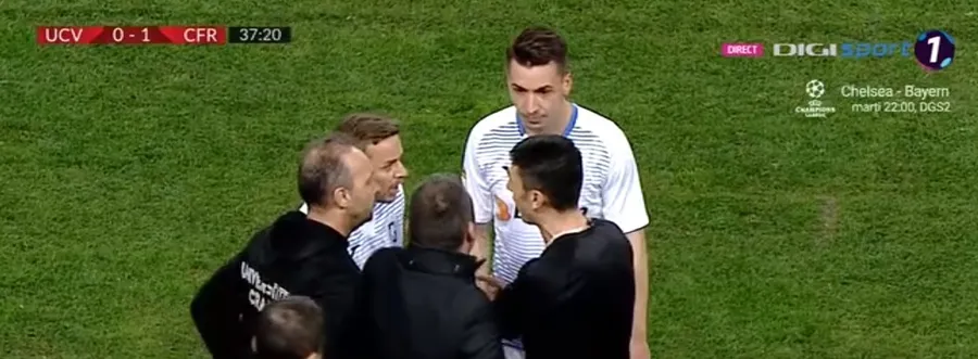 A fost tensiune la partida Craiova- CFR Cluj. Fanii au aruncat cu obiecte pe teren, iar arbitrul a amenințat că întrerupe partida. Nicușor Bancu a fost „delegat” să negociezii cu suporterii.