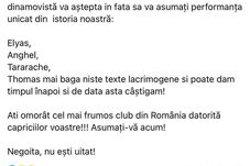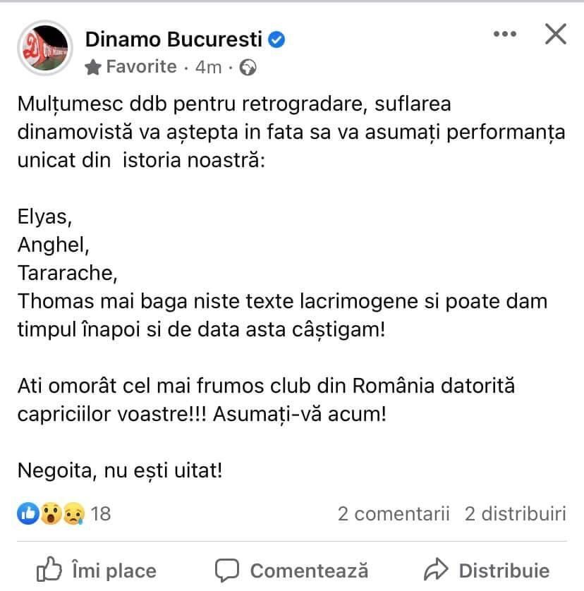 Textul apărut pe pagina oficială de Facebook a clubului Dinamo