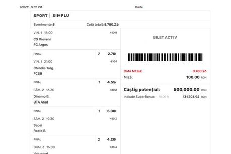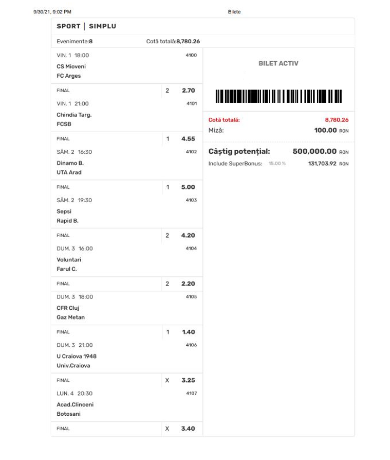 Dacă pariezi 100 de lei, așa cum dorește Dumitru Dragomir, atunci câștigul potențial poate să fie de 500.000 de lei la o cotă totală de 8.780,26.