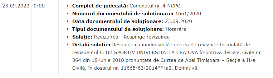 Iar semnele că Pavel Badea are șanse și mai mici, să obțină palmaresul legendarei Universitatea Craiova, la Înalta Curte de Casție și Justiție, sunt din ce în ce mai clare. ProSport vă informează că pe data de 23 septembrie judecătorii au decis să îi respingă Clubului Sportiv Universitatea Craiova cererea de revizuire împotriva deciziei civile nr 364 din 18 iunie 2018 pronunțată de curtea de Apel Timișoara-Secția a doua civilă, în dosarul numărul 11665/63/2014. Definitivă.