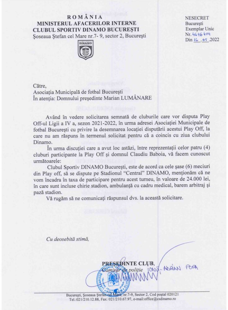 Pe 10 mai am fost de acord cu cererea lor, dar să vină un punct oficial de la Minister până pe data de 11 mai. Într-o adresă venită ieri cluburile ne-au spus că a fost ziua clubului Dinamo și de aceea nu s-a putut răspunde în timp util”, a declarat Marian Lumînare pentru ProSport.