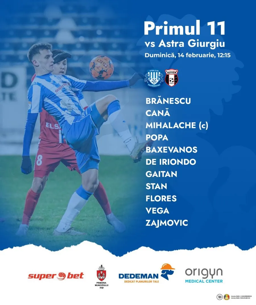 Poli Iași: Brănescu – Cană, Mihalache, R. Popa, Baxevanos – Gaitan, De Iriondo, A. Stan – Flores, Zajmovic, Vega