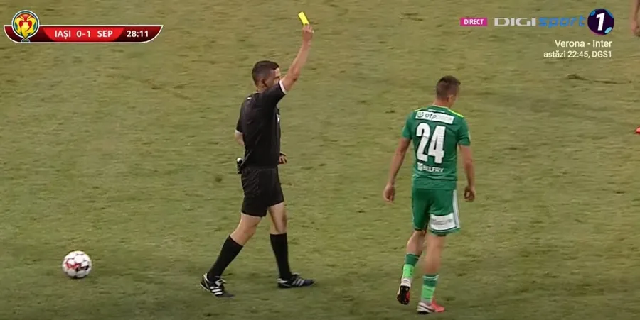Min28: Istvan Fulop este avertizat cu cartonașul galben pentru un atac neglijent la Francisc Cristea