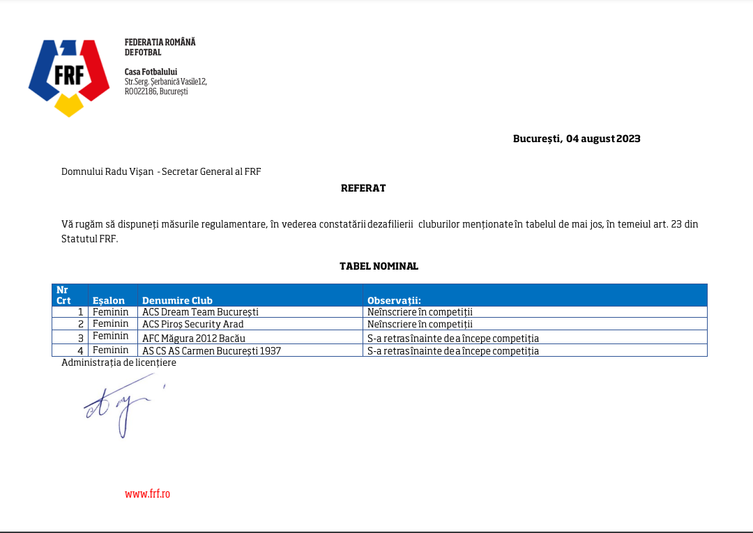 Vineri, 4 august, Federația Română de Fotbal publica, pe site-ul oficial, hotărârile Comitetului de Urgență. Printre subiecte, și dezafilierea echipei Carmen București din fotbalul feminin. Decizia este una surprinzătoare deoarece, la capătul stagiunii trecute, formația bucureșteană a cucerit, în premieră, Cupa României la fotbal feminin după o victorie în ultimul act cu Universitatea Cluj, campioana din ultimele 11 ediții ale campionatului, scor 2-1.