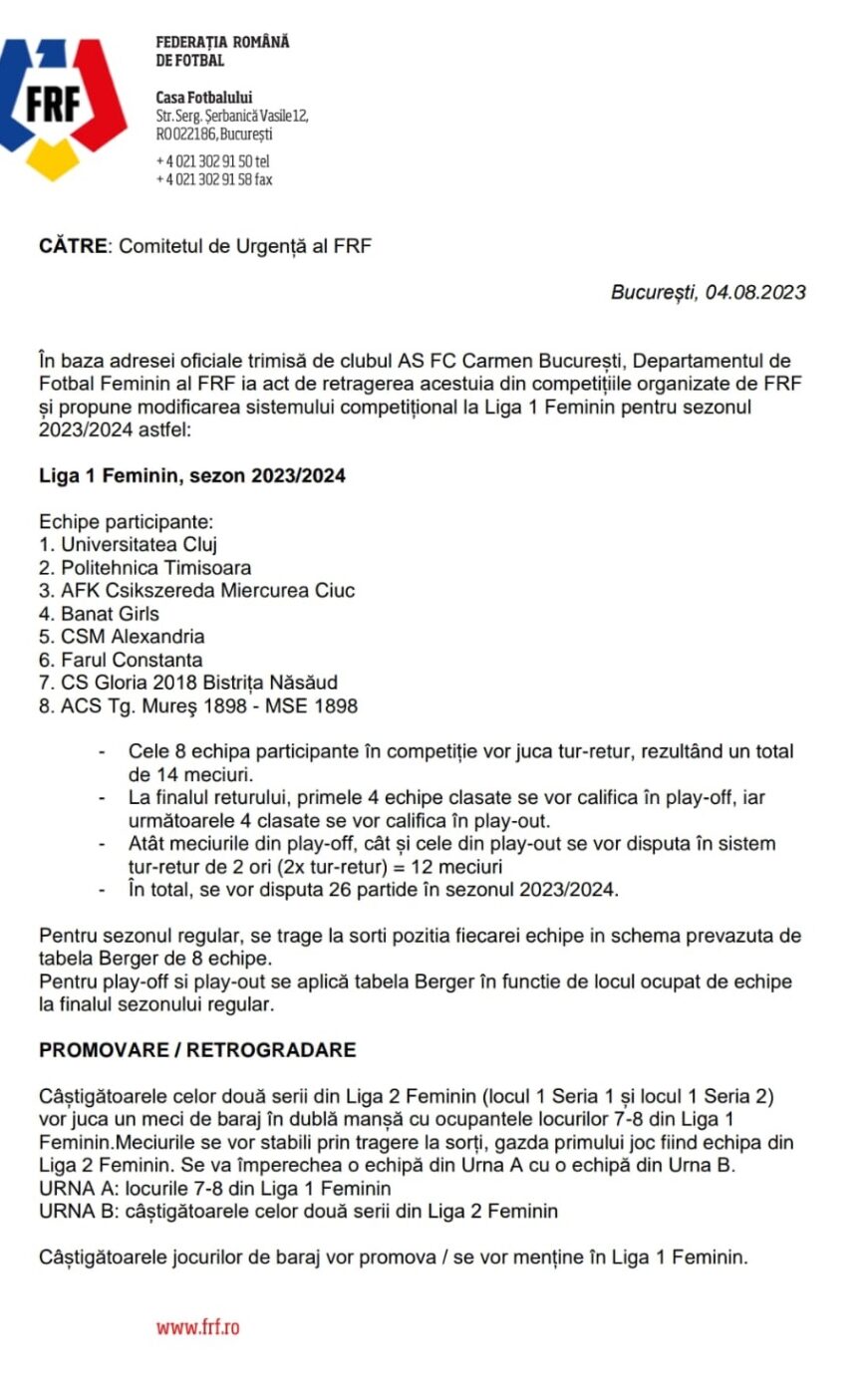 Imediat după dezafilierea celor de la Carmen, FRF a decis modificarea sezonului competițional 2023-2024 (VEZI FOTO).