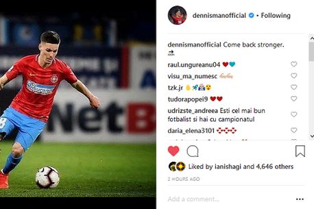 Dennis Man (20 de ani) a fost suspendat două etape de către Comisia de Disciplină din cadrul FRF după incidentele din timpul meciului FCSB – Craiova 3-2, când l-a lovit cu capul peste fața pe Marius Briceag. La scurt timp după aflarea deciziei, „perla” FCSB-ului a transmis un mesaj prin intermediul paginii sale de Instagram.