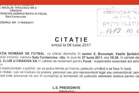 Dovadă FRF prezintă citația de la tribunal în „cazul Craiova”, înregistrată pe 10.06.2011