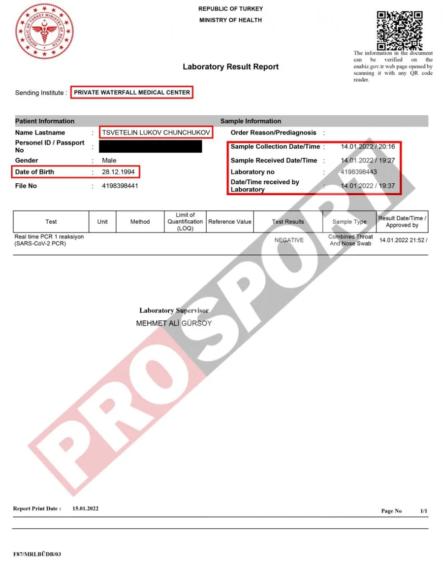 Pentru comparație, vă prezentăm un test realizat de un român, care a fost în Turcia de Revelion. Se pot vedea cu ușurință orele prelevării și a preluării de către laborator! Ele sunt, așa cum e firesc pe această planetă, în ordine cronologică și diferența este peste 2 ore, ca interval, pentru un singur test.