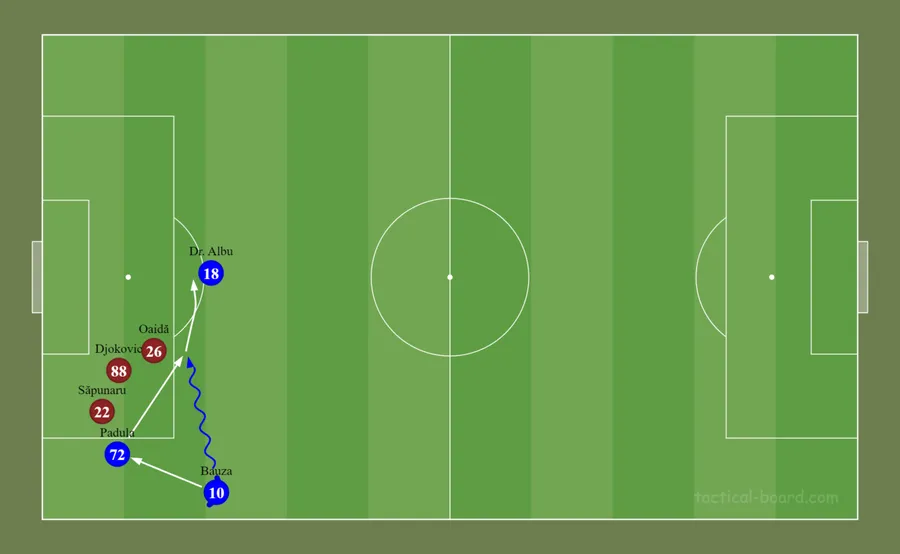În plus, tehnica lui nu e statică, nu e bijuterie pentru o nuntă de cartier, ci are eficiența cerută de fotbalul modern. Bauza a dinamizat permanent și a pus talentul să lucreze pe pârghiile echipei, spre modificarea tabelei. Un exemplu de măiestrie elocventă pentru aceste elemente vine din povestea golului de 1-0.