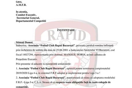 „Asociația Fotbal Club Rapid București optează pentru terminarea campionatului 2019-2020 din Liga 4, în sistemul FRF adoptat și implementat pentru Liga 3. Asociația Fotbal Club Rapid București menționează ca odată cu adoptarea modelului FRF pentru Liga 3 CSA Steaua să-și respecte toate obligațiile față de toate colegele de competiție”, se arată în documentul trimis de către rapidiști către AMFB și publicat pe pagina oficială de Facebook.