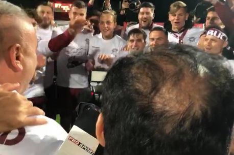 Imediat după ce arbitrul partidei Rapid București – FC U Craiova, scor 1-3, a fluierat finalul partidei, jucătorii lui Mihai Iosif au intrat pe teren pentru a sărbători calificarea în prima ligă din România. Mai mult, fotbaliștii grupării din Giulești l-au aruncat în aer pe antrenorul principal și au cântat pentru el.