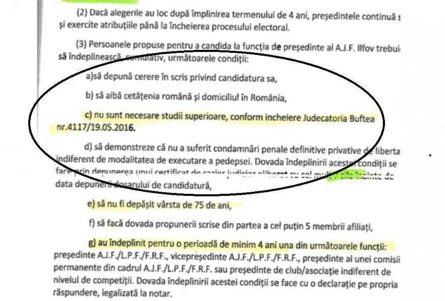 FR de Fotbal, conform statului-cadru pentru toate AJF-urile din țară, nu permite candidatura acestuia. Dar la Ilfov se poate! Áceste prevederi statutare – vârsta și studiile – se aplică la toate AJF-urile din România.