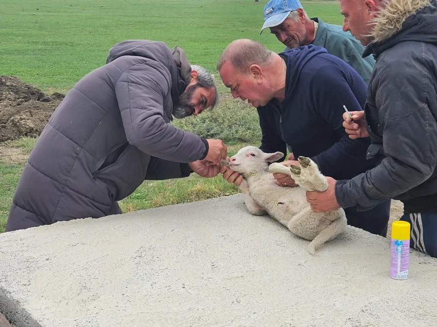 Cosmin Bărcăuan și nașul Gigi Nețoiu îngrijesc un miel la ferma de la Cetate. Foto- Cătălin Mureșanu – ProSport