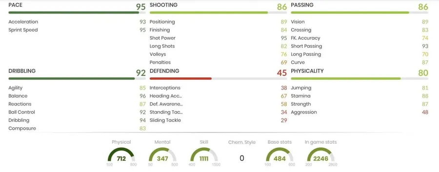 Bergwijn are niște statistici foarte bune pentru poziția de atacant dreapta. Folosit într-o chimie de tipul Sniper, olandezul ajunge la o viteză totală de 95, un șut de 93, pasă 86 și un dribbling senzațional de 98. Deși are un preț destul de ridicat, jucătorul celor de la Tottenham este un card ce poate fi decisiv în multe momente ale jocului și vă recomandăm să îl integrați în echipă. Acestea sunt statisticile in-game basic, fară nici o chimie aplicată.