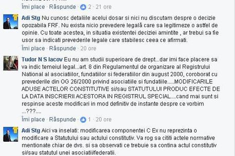 În aceeași zi, pe contul său de Facebook, Iacov a avut o discuție pe această temă cu Adrian Stângaciu, juristul FRF. Acesta din urmă a susținut că nu există nicio problemă, fără a furniza argumente concrete.