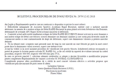 Foarte important este că, pentru a doua oară în ultimele șase luni, creditorii au respins propunerile lichidatorului judiciar Mihai Florea, în privința condițiilor de licitație. În raportul privind ordinea de zi a Adunării creditorilor întocmit de Florea pe 12 februarie erau înaintate alte condiții pentru licitație: „Având în vedere că, în acest moment, procedura de valorificare este, practic, blocată, lichidatorul judiciar recomandă ca prețul de pornire la licitație pentru activele FC Rapid SA să fie cel stabilit în raportul de evaluare întocmit în cadrul procedurii, respectiv 406.000 euro plus TVA„.