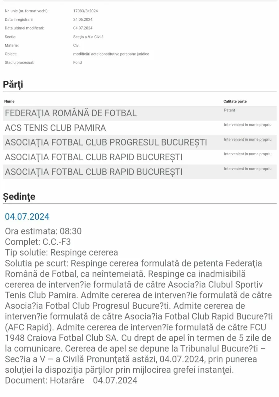 A doua zi, judecătorul care l-a dat afară din ședință pe șeful alb-albaștrilor din Bănie a oferit soluția care l-a făcut să jubileze pe milionar. Cererea celor de la FCU Craiova, Progresul București, respectiv AFC Rapid, a fost admisă.