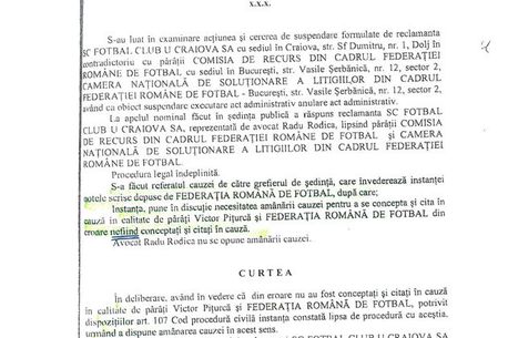 Mircea Sandu a contraatacat ieri, tot cu acte (foto). El a prezentat un document asemănător, tot o încheiere de ședință, de la Curtea de Apel Craiova, prin care erau citate în calitate de pârâți Comisia de Recurs a FRF și Camera Națională de Soluționare a Litigiilor, iar judecătoarea Laura Chimoiu cerea amânarea cauzei pentru „a se concepta și a se cita în cauză, în calitatea de pârâți, Victor Pițurcă și Federația Română de Fotbal, care din eroare nu au fost conceptați și citați în cauză”.