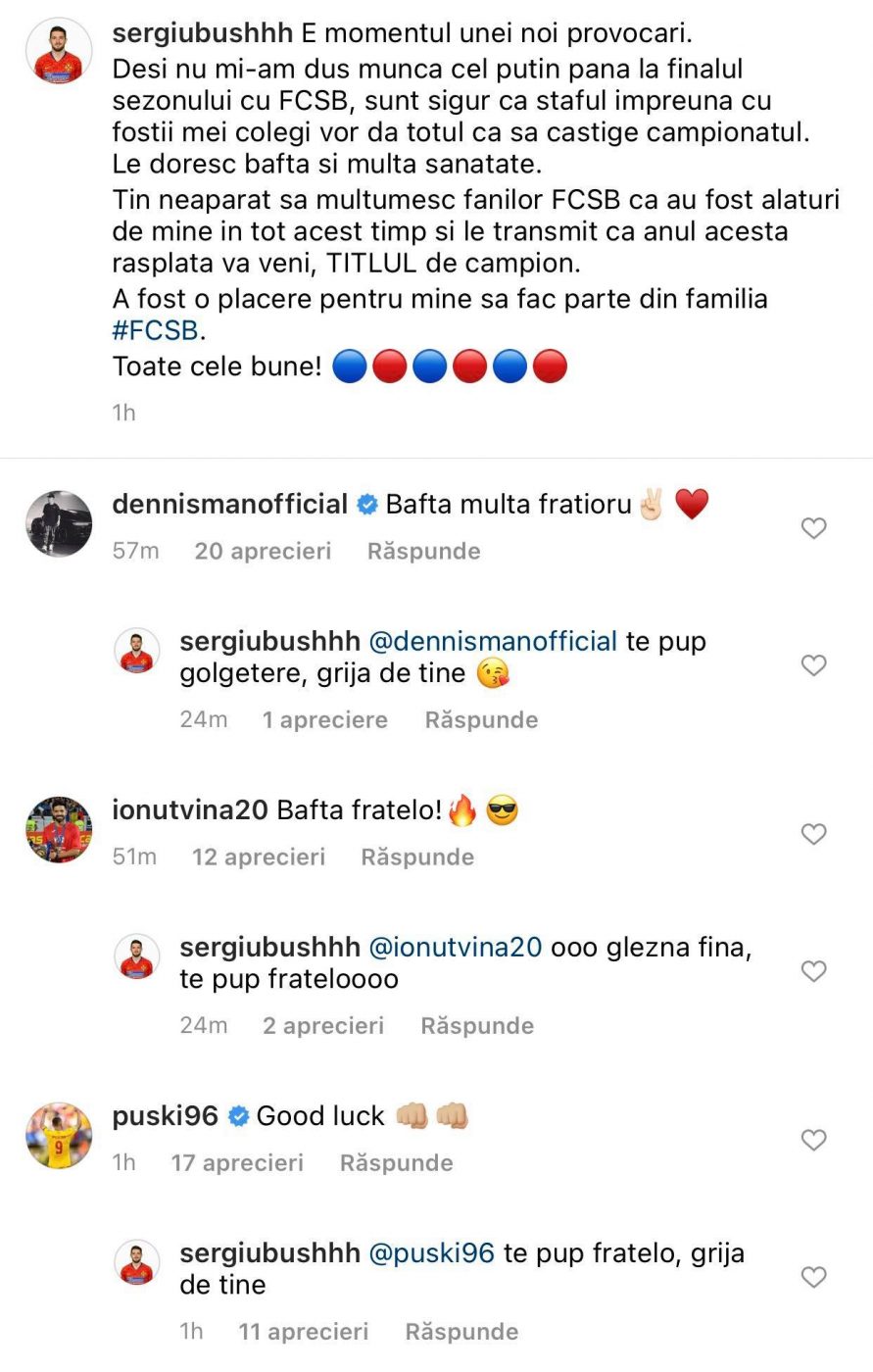 Țin neapărat să mulțumesc fanilor FCSB că au fost alături de mine în tot acest timp și le transmis că anul acesta răsplata va veni, titlul de campion. A fost o plăcere pentru mine să fac parte din familia FCSB. Toate cele bune”, a scris Sergiu Buș pe contul său de Instagram.