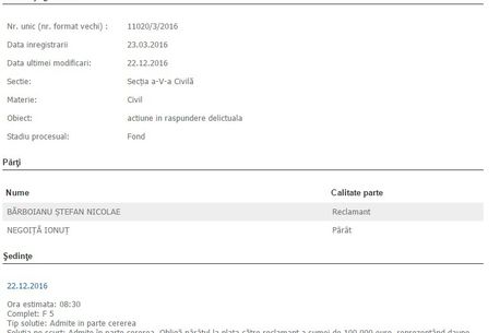 Tribunalul București, prima instanță care a judecat procesul intentat de actualul jucător al Concordiei Chiajna, îi dă dreptate lui Bărboianu și-l obligă pe Negoiță la plata a nu mai puțin de 100.000 de euro daune morale. Mai mult, patronul din Ștefan cel Mare e obligat să publice în presă, pe propria cheltuială, decizia instanței.