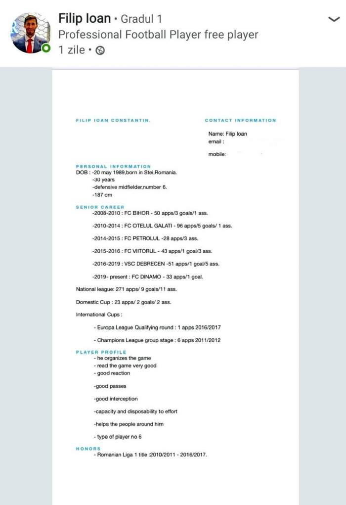 Fostul mijlocaș al lui Dinamo și-a actualizat CV-ul pe Linkedin imediat după plecarea de la formația patronată de Ionuț Negoiță și a trecut acolo toate echipele pe la care a trecut pe parcursul carierei: FC Bihor, Oțelul Galați, Petrolul Ploiești, Viitorul Constanța, Debrecen și Dinamo.