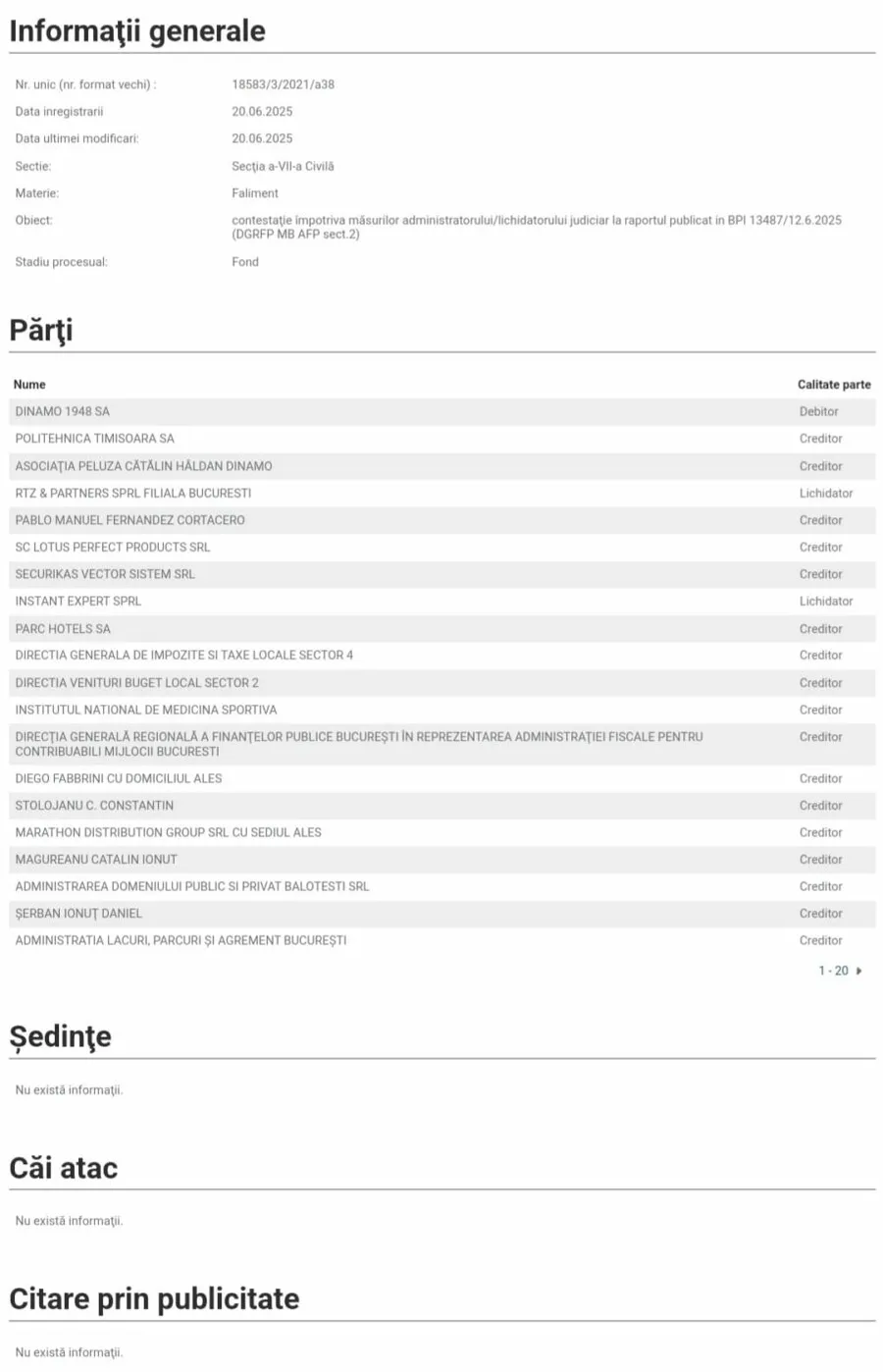 Dinamo, prin administratorul judiciar RTZ & Partners SPRL, s-a adresat judecătorului sindic cu cerere de ieșire din insolvență, iar luni va fi judecată solicitarea. Vineri, cu două zile înainte de acest termen, Agenția Națională de Administrație Fiscală a formulat o contestație asupra raportului de închidere a procedurii.