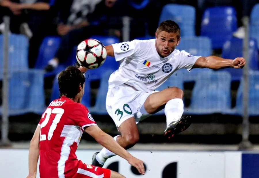 Sorin Frunza (D), de la Unirea Urziceni, se lupta pentru balon cu Stefano Celozzi (S), de la VfB Stuttgart, in timpul meciului din etapa a doua a Ligii Campionilor la fotbal, grupa G, partida disputata pe stadionul „Steaua”, in Bucuresti, marti, 29 septembrie 2009. BOGDAN MARAN / MEDIAFAX FOTO