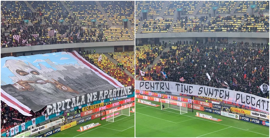 Înainte de fluierul de start al partidei, suporterii lui FCSB au afișat un banner uriaș cu mesajul „Pentru tine suntem plecați” destinat patronului Gigi Becali cu care Peluza Nord se află în conflict.