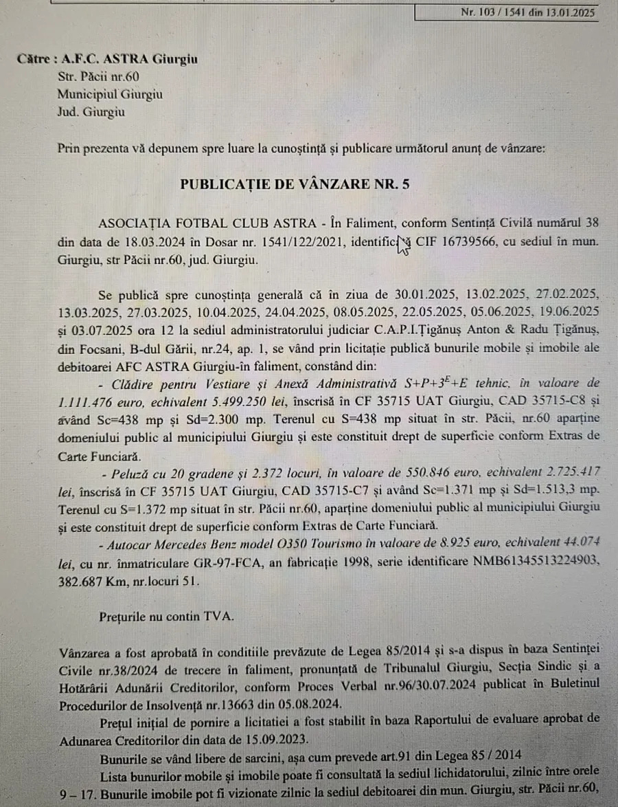 Joi, 30 ianuarie, la Focșani, au fost scoase la vânzare, din nou, prin licitație publică, peluza stadionului Marin Anastasovici din Giurgiu, vestiarele și clădirea administrativă care aparțin debitoarei Asociației Fotbal Club Astra, debitor care se află în faliment. La licitație nu s-a prezentat nimeni!