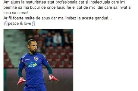 Pe pagina lui de Facebook, portarul lui ASA Târgu Mureș a postat un mesaj mai amplu. În introducere, el conține un citat de Ralph Waldo Emerson: „Poți folosi orice limbaj dorești, niciodată nu poți spune altceva decât ceea ce ești”.