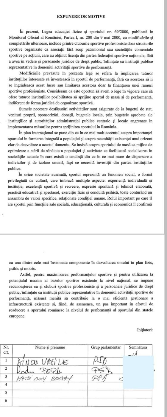 Senatorul Vasile Dîncu a depus în Parlamentul României un proiect de lege prin care solicită modificarea și completarea Legii Sportului 69/2000. Mai precis, proiectul fostului ministru al Apărării Naționale propune ca persoanele juridice de drept public să aibă statut de cluburi sportive profesioniste, la fel ca societățile comerciale sportive sau asociațiile.