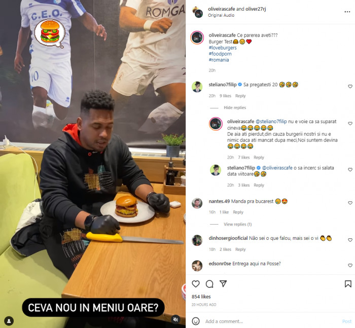 Reacția lui Steliano Filip a apărut imediat! Fotbalistul în vârstă de 27 de ani a profitat de faptul că brazilianul Eric de Oliveira a postat o imagine în care mânca un hamburger și i-a lăsat un mesaj prin care l-a înțepat pe „Puriu”.